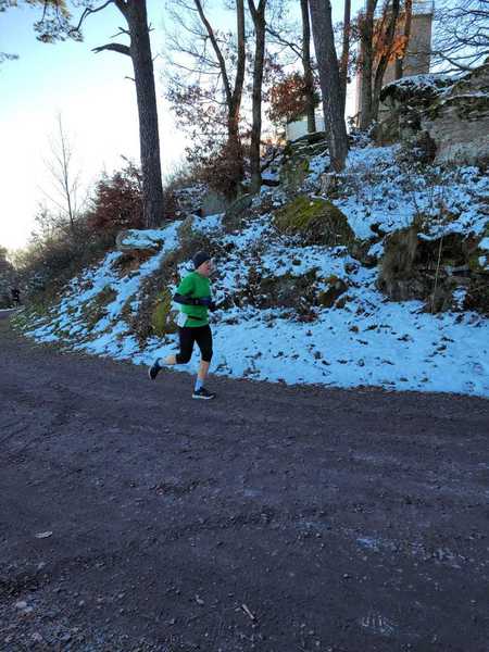 Vom Start weg legte Patrik Döringer, der sich seit Wochen in der „Form seines Lebens“ befindet, ein sehr ambitioniertes Tempo vor, dem nur Hendrik Kopp folgen konnte. Nach dem ersten Anstieg nach Neunkirchen am Potzberg kommt eine Flachpassage zum Atemholen, gefolgt von dem nächsten Anstieg nach Föckelberg. In dieser Passage wurde sich Patrik bewusst, was noch alles auf ihn zukommt und er nahm etwas Tempo heraus. Denn in Föckelberg selbst geht es richtig zur Sache, zwei „giftige“ Rampen mit Steigungen um 10% verlangen den Läufern alles ab. Das war für Hendrik die Gelegenheit, um auf Patrik aufzuschließen und seinerseits, da er noch genügend „Körner“ übrighatte, sein Tempo zu erhöhen und vorbeizuziehen. Auf dem nun folgenden langgezogenen Bogen bergaufwärts zum Ziel vergrößerte er nun stetig seinen Vorsprung.